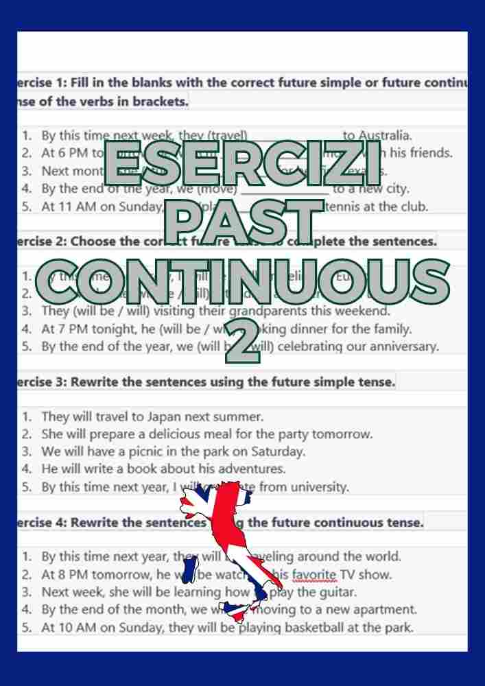 Questi esercizi sono pensati per aiutarti a praticare il livello di inglese, concentrandosi sul futuro semplice e il futuro continuo. Sono suddivisi in dieci esercizi, con risposte incluse, per aiutarti a rafforzare la comprensione e l'uso corretto di queste strutture verbali.