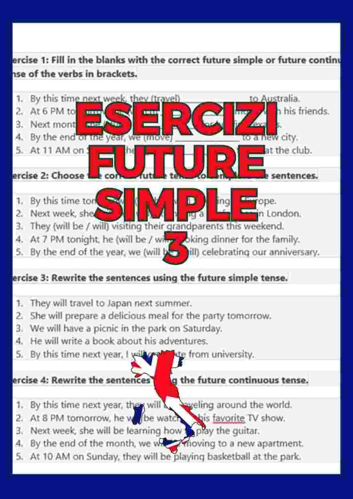 Questi esercizi sono pensati per aiutarti a praticare il livello di inglese, concentrandosi sul futuro semplice e il futuro continuo. Sono suddivisi in dieci esercizi, con risposte incluse, per aiutarti a rafforzare la comprensione e l'uso corretto di queste strutture verbali.