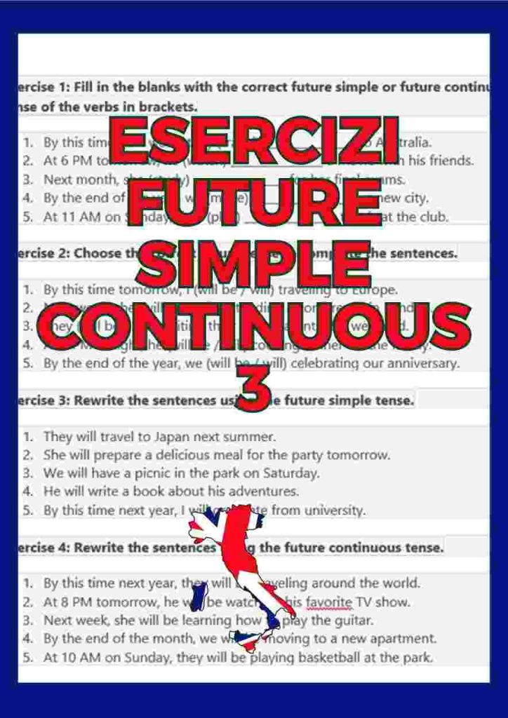 Questi esercizi sono pensati per aiutarti a praticare il livello di inglese, concentrandosi sul futuro semplice e il futuro continuo. Sono suddivisi in dieci esercizi, con risposte incluse, per aiutarti a rafforzare la comprensione e l'uso corretto di queste strutture verbali.
