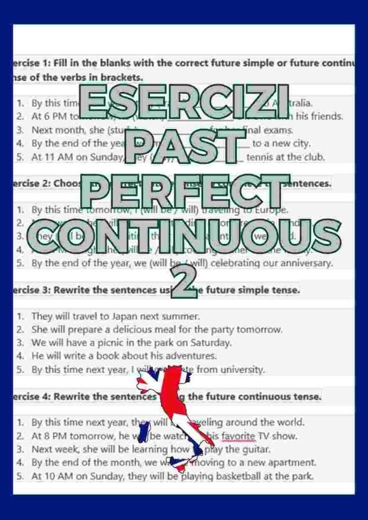 Questi esercizi sono pensati per aiutarti a praticare il livello di inglese, concentrandosi sul futuro semplice e il futuro continuo. Sono suddivisi in dieci esercizi, con risposte incluse, per aiutarti a rafforzare la comprensione e l'uso corretto di queste strutture verbali.