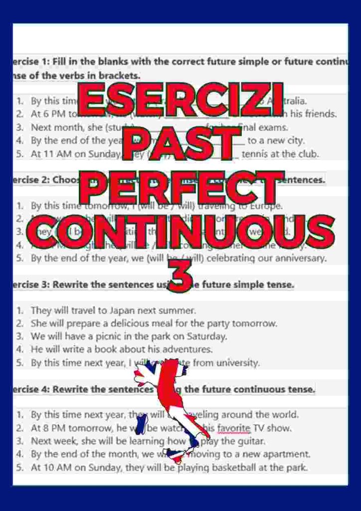 Questi esercizi sono pensati per aiutarti a praticare il livello di inglese, concentrandosi sul futuro semplice e il futuro continuo. Sono suddivisi in dieci esercizi, con risposte incluse, per aiutarti a rafforzare la comprensione e l'uso corretto di queste strutture verbali.