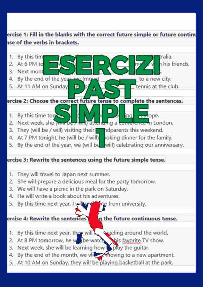 Questi esercizi sono pensati per aiutarti a praticare il livello di inglese, concentrandosi sul futuro semplice e il futuro continuo. Sono suddivisi in dieci esercizi, con risposte incluse, per aiutarti a rafforzare la comprensione e l'uso corretto di queste strutture verbali.