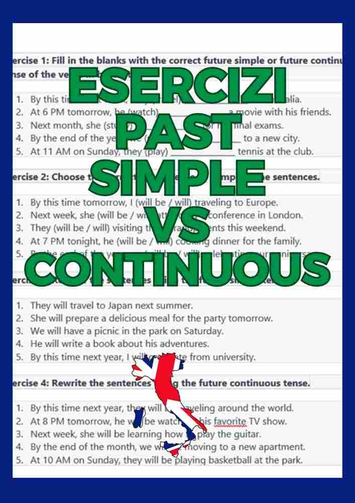 Questi esercizi sono pensati per aiutarti a praticare il livello di inglese, concentrandosi sul futuro semplice e il futuro continuo. Sono suddivisi in dieci esercizi, con risposte incluse, per aiutarti a rafforzare la comprensione e l'uso corretto di queste strutture verbali.