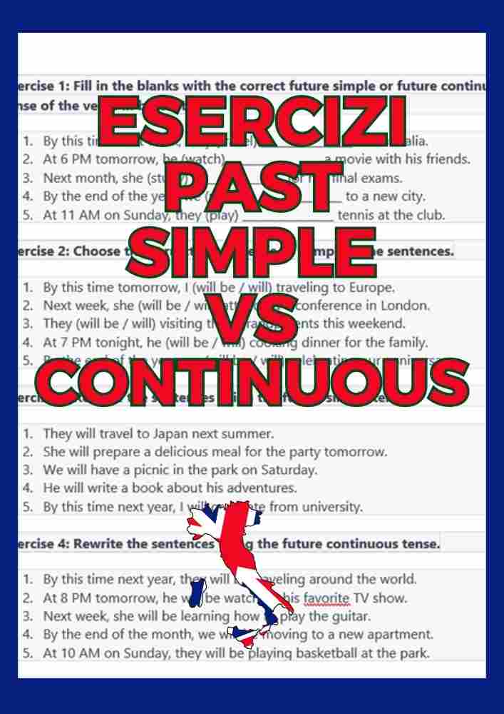 Questi esercizi sono pensati per aiutarti a praticare il livello di inglese, concentrandosi sul futuro semplice e il futuro continuo. Sono suddivisi in dieci esercizi, con risposte incluse, per aiutarti a rafforzare la comprensione e l'uso corretto di queste strutture verbali.