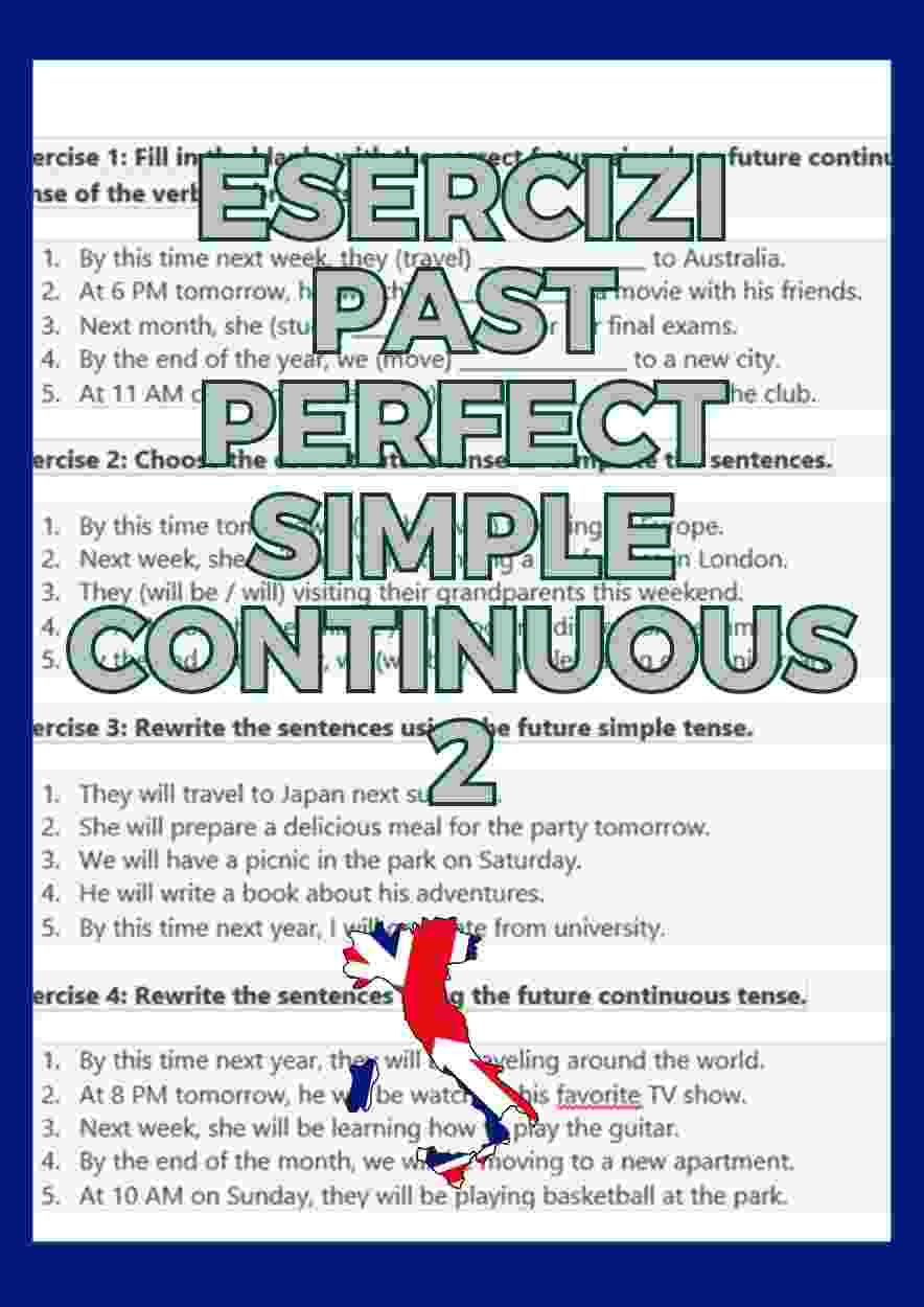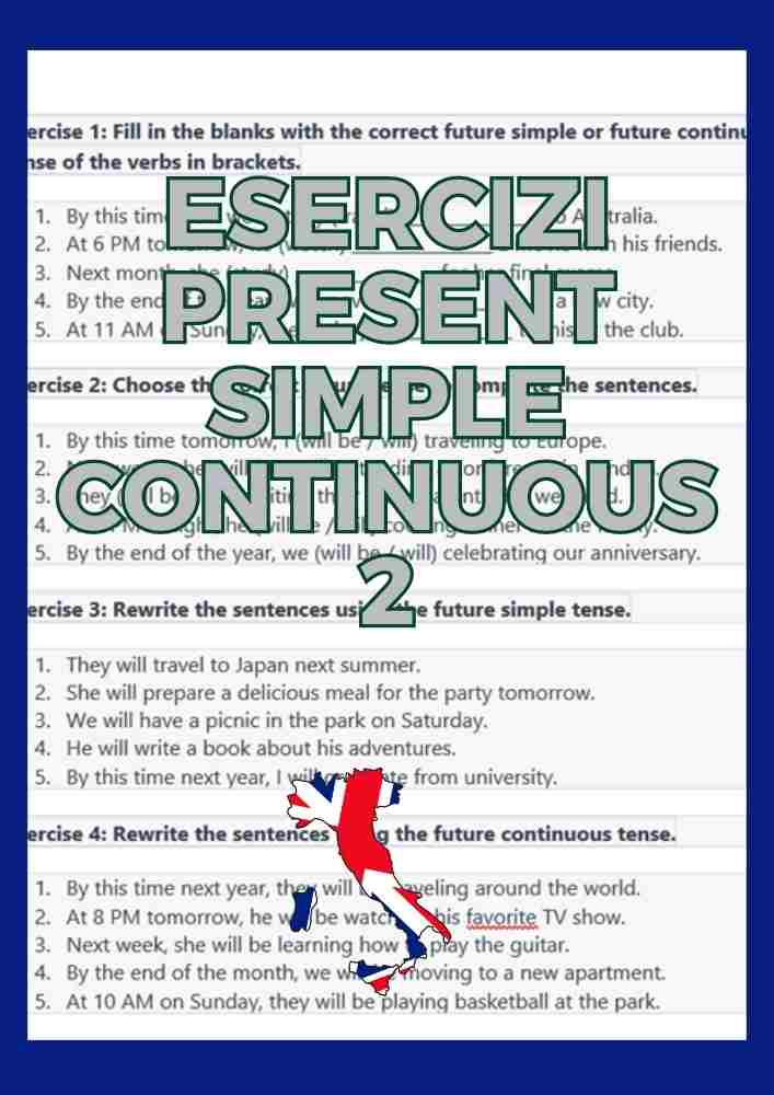 Questi esercizi sono pensati per aiutarti a praticare il livello di inglese, concentrandosi sul futuro semplice e il futuro continuo. Sono suddivisi in dieci esercizi, con risposte incluse, per aiutarti a rafforzare la comprensione e l'uso corretto di queste strutture verbali.