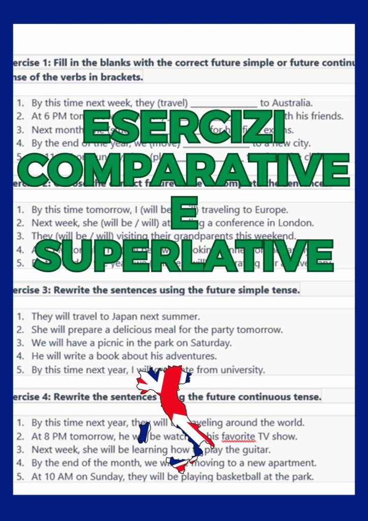 Questi esercizi sono pensati per aiutarti a praticare il livello di inglese, concentrandosi sul futuro semplice e il futuro continuo. Sono suddivisi in dieci esercizi, con risposte incluse, per aiutarti a rafforzare la comprensione e l'uso corretto di queste strutture verbali.